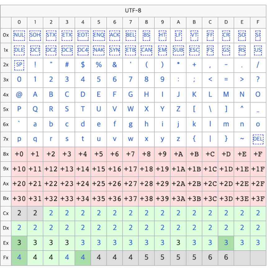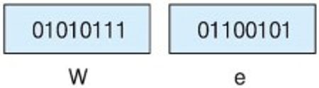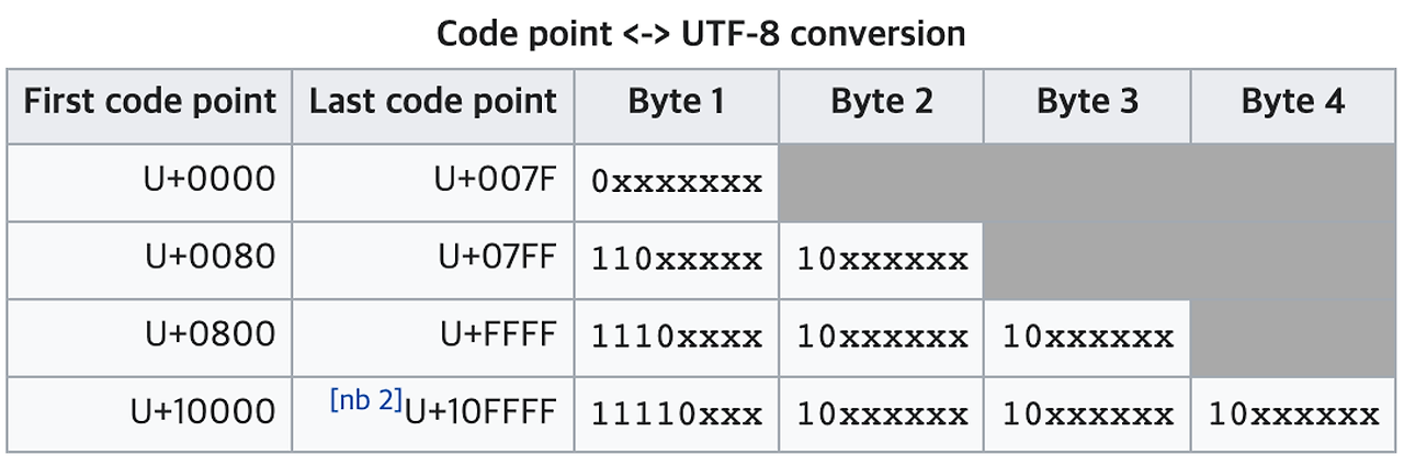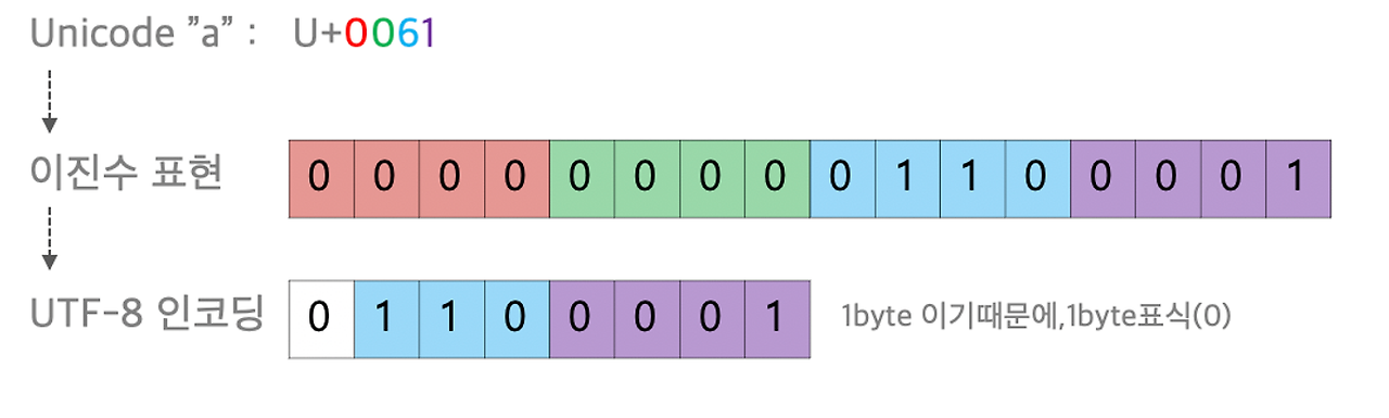 - ASCII 인코딩을 사용하여 각 문자에 대해 8비트가 할당된다.