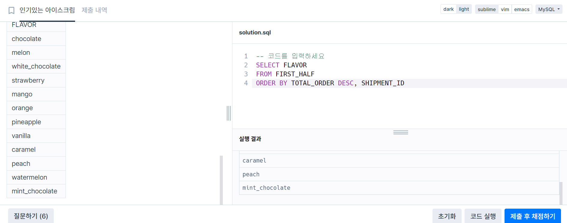 상반기 아이스크림 맛을 총주문량을 기준으로 내림차순 정렬하고 총주문량이 같은 경우 출하 번호를 기준으로 오름차순 정렬하면 chocolate, melon, white_chocolate, strawberry, mango, orange, pineapple, vanilla, caramel, peach, watermelon, mint_chocolate 순서대로 조회되어야 합니다. 따라서 SQL문을 실행하면 다음과 같이 나와야 합니다.