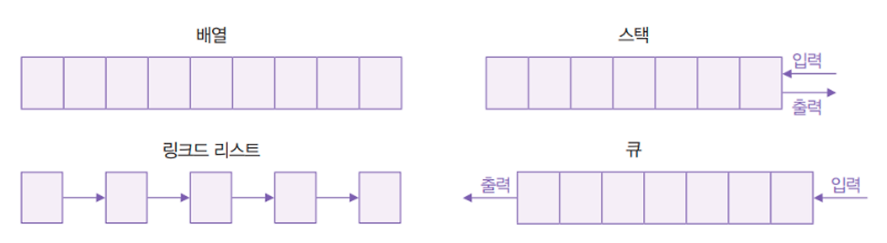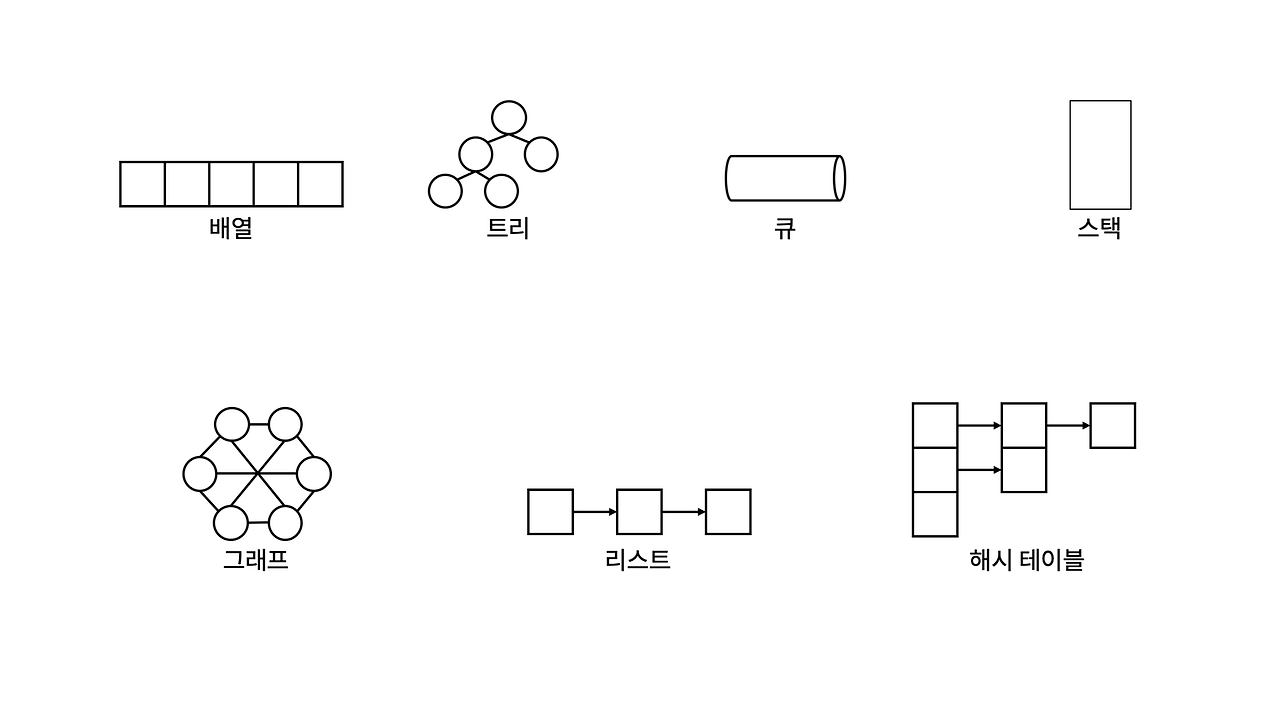 자료구조에는 배열, 리스트, 벡터, 큐, 스택, 해시 테이블 등이 있다.