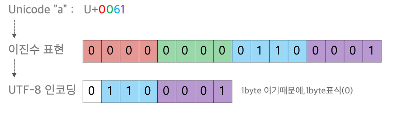 - 대문자 'A'는 ASCII코드에서 65에 해당하는 값으로 표현, 이진수로 01000001 이다.