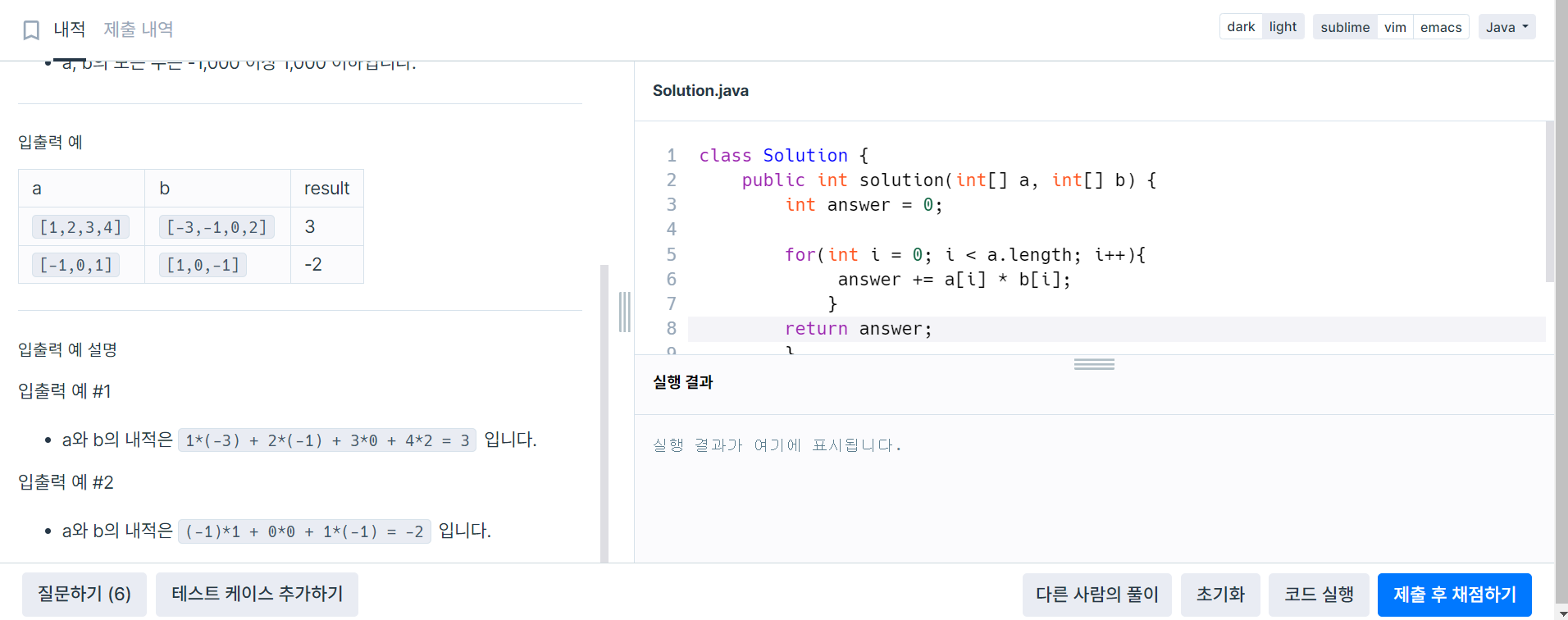 길이가 같은 두 1차원 정수 배열 a, b가 매개변수로 주어집니다. a와 b의 내적을 return 하도록 solution 함수를 완성해주세요.