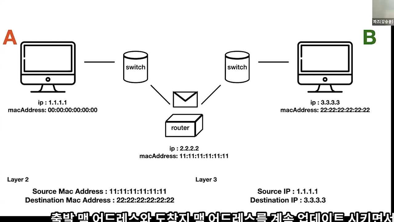 디캡슐화(수신) : 상위 계층으로 올라갈수록 디캡슐화가 진행된다.