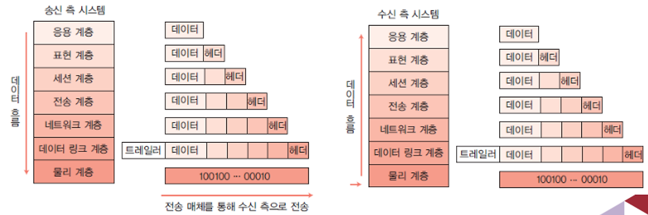 물리와 응용 계층을 제외한 나머지 계층에서는 데이터 시작 부분과 끝 부분에 헤더나 트레일러 형태로 정보를 추가한다.