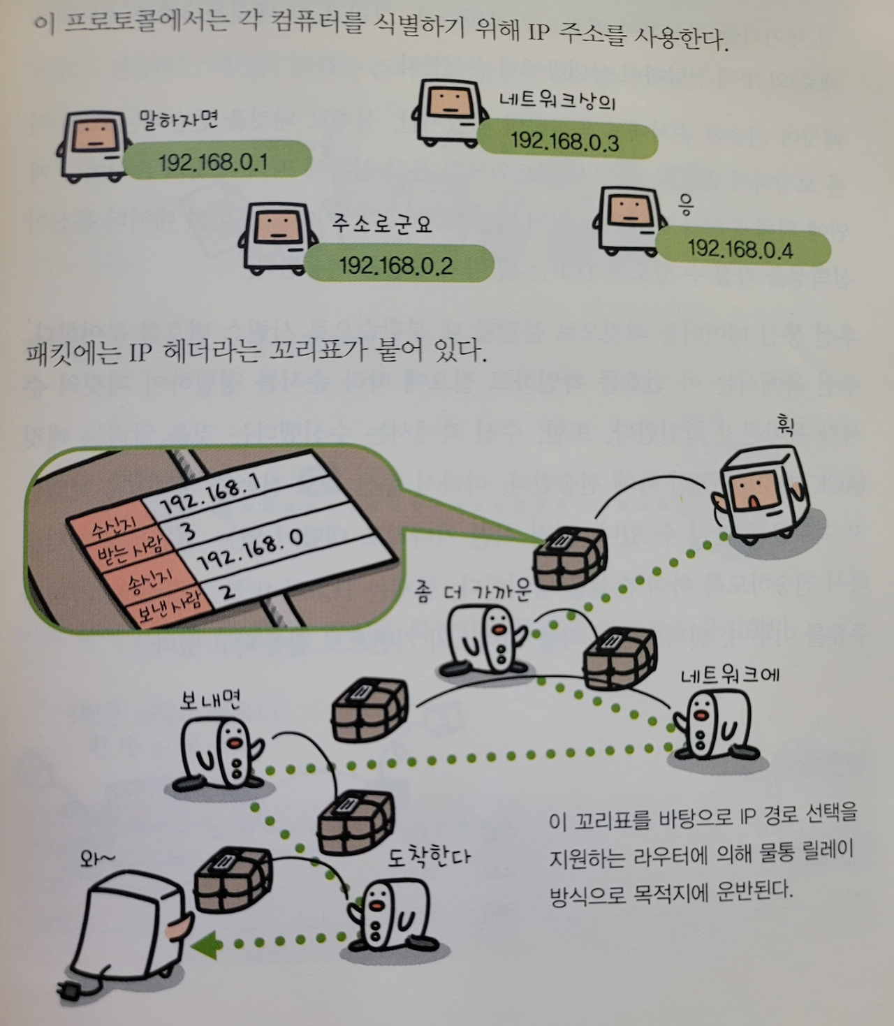 - 헤더 : 패킷 길이, 프로토콜, 송/수신 사람의 IP주소 등이 포함된다