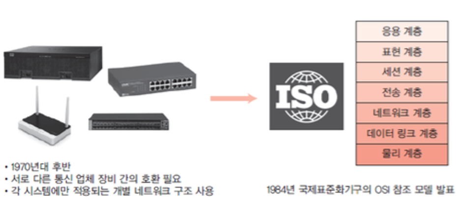 - 1970년대 국제 표준화 기구 (ISO)에서 OSI 7계층 모델을 만들어 네트워크 기본 구조를 가이드 하였다.