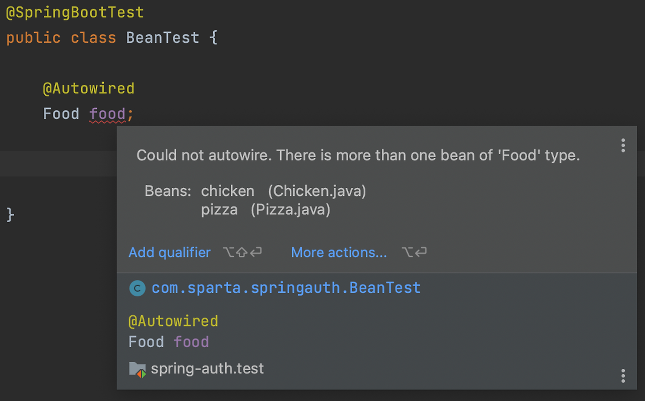 해석 : Food타입의 Bean객체 하나 이상있어서 그렇다. 결국 우선순위를 정해달라