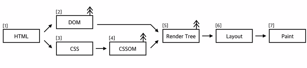 - 1~4 HTML 파일과 CSS 파일을 파싱하여 DOM Tree*, CSSOM Tree *를 만든다.(Parsing)