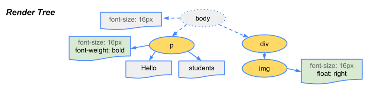 - 두 Tree를 결합하여 Rendering Tree*를 만든다.(Style)