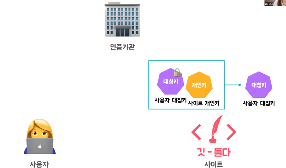 대칭키/ 비대칭키 방식을 모두 사용하여 요청/응답 정보를 모두 암호화 하고 외부 인증기관(외부 서버)이 유효한지(신뢰) 보증인 역할을 한다.