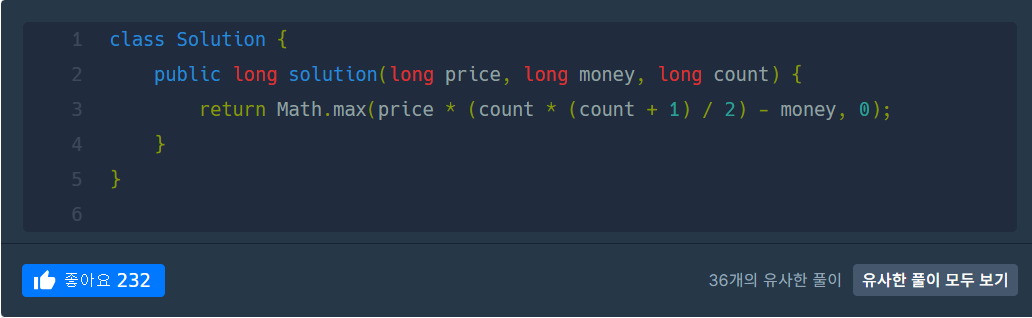 놀이기구를 count번 타게 되면 현재 자신이 가지고 있는 금액에서 얼마가 모자라는지를 return 하도록 solution 함수를 완성하세요.