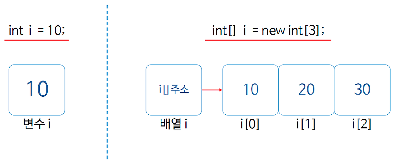 1차원 배열은 연속적 공간에 할당되며 주소값(i) 기준 0부터 주소가 1씩 더해진다.