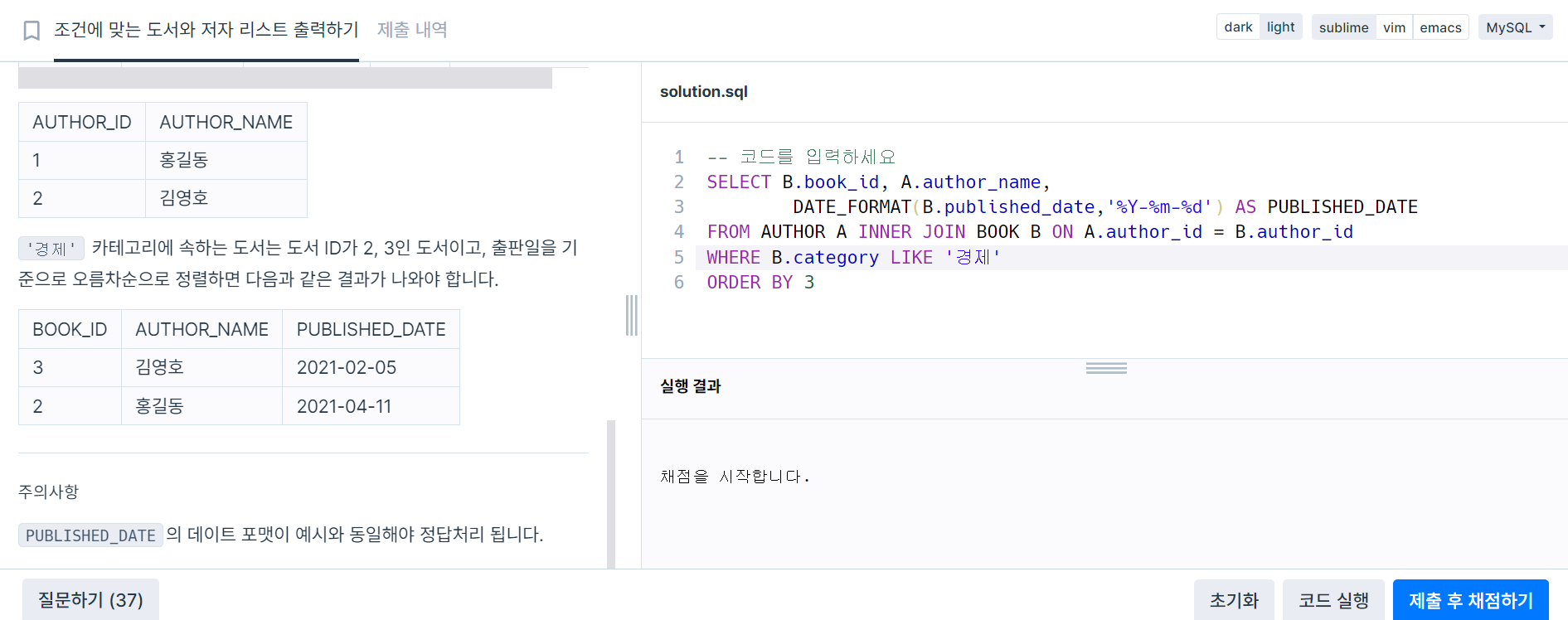 조건에 맞는 도서와 저자 리스트 출력하기 (MySQL) 본문