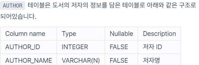 BOOK 테이블은 각 도서의 정보를 담은 테이블로 아래와 같은 구조로 되어있습니다.