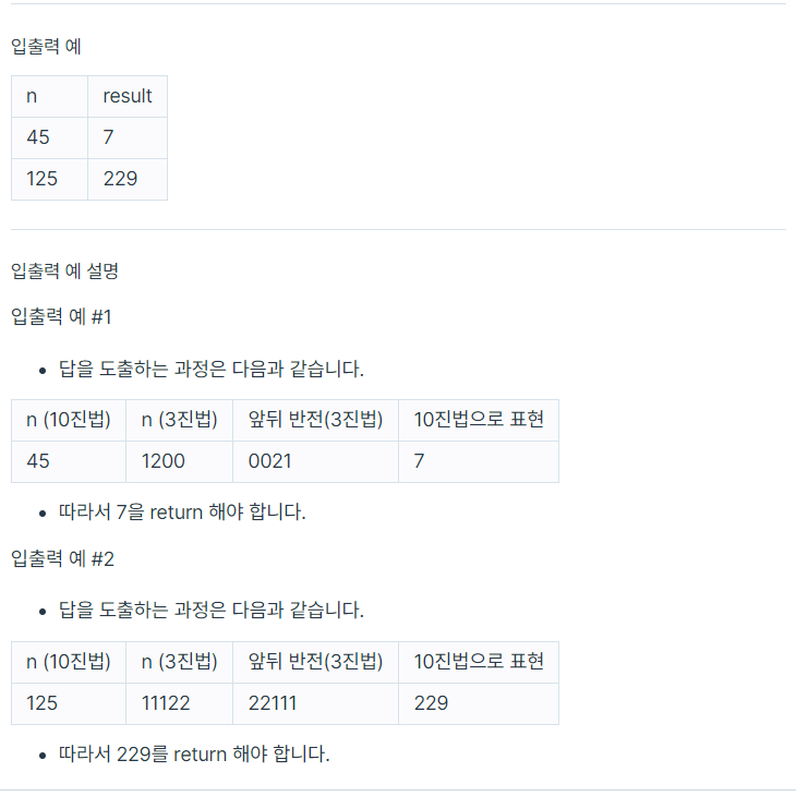자연수 n이 매개변수로 주어집니다. n을 3진법 상에서 앞뒤로 뒤집은 후, 이를 다시 10진법으로 표현한 수를 return 하도록 solution 함수를 완성해주세요.