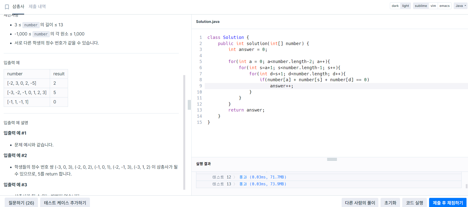 한국중학교 학생들의 번호를 나타내는 정수 배열 number가 매개변수로 주어질 때, 학생들 중 삼총사를 만들 수 있는 방법의 수를 return 하도록 solution 함수를 완성하세요.