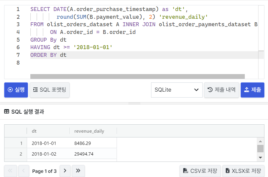 주문 각각에 대해 매출이 일어나는 시점은 olist_orders_dataset 테이블의 order_purchase_timestamp 컬럼에 기록되고, 주문 금액은 olist_order_payments_dataset 테이블의 payment_value 컬럼에 기록됩니다.