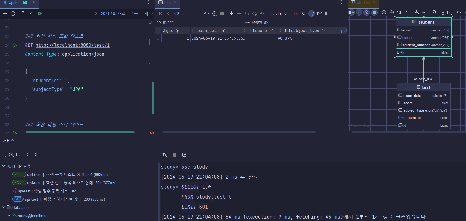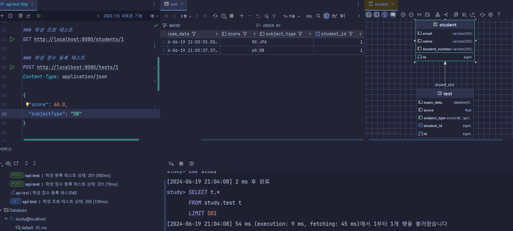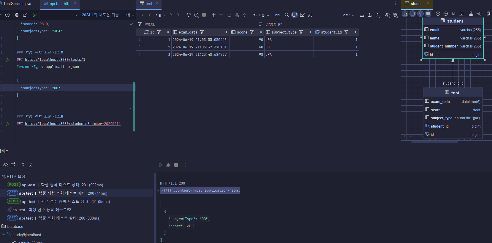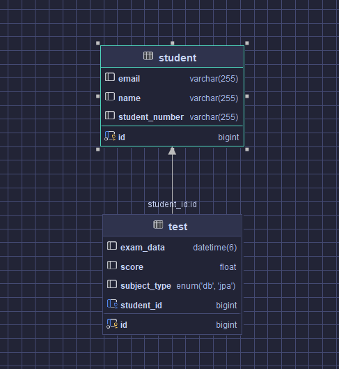 과목타입고유번호 Long 학생_아이디 Long 점수 Float 과목타입 Enum 시험일 LocalDateTime JPA DB