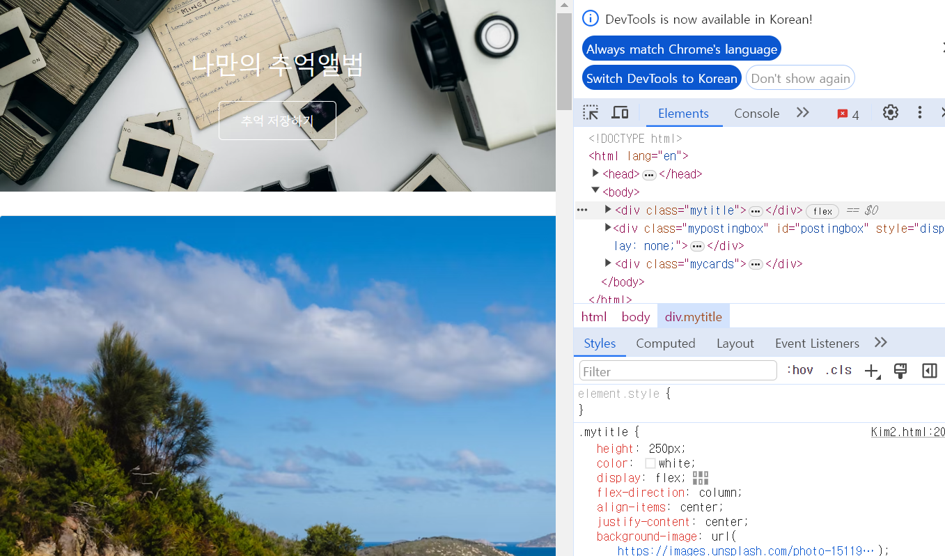 추억 저장하기 버튼 클릭하면 토글이 작동되는것을 볼 수 있다