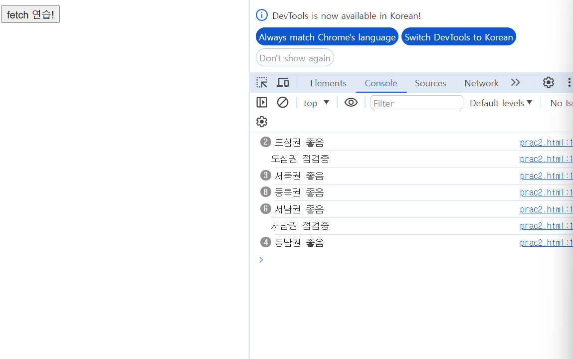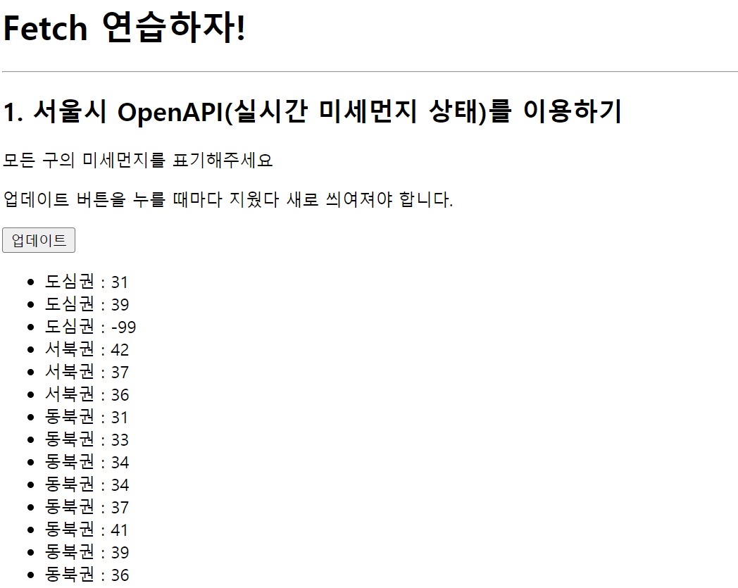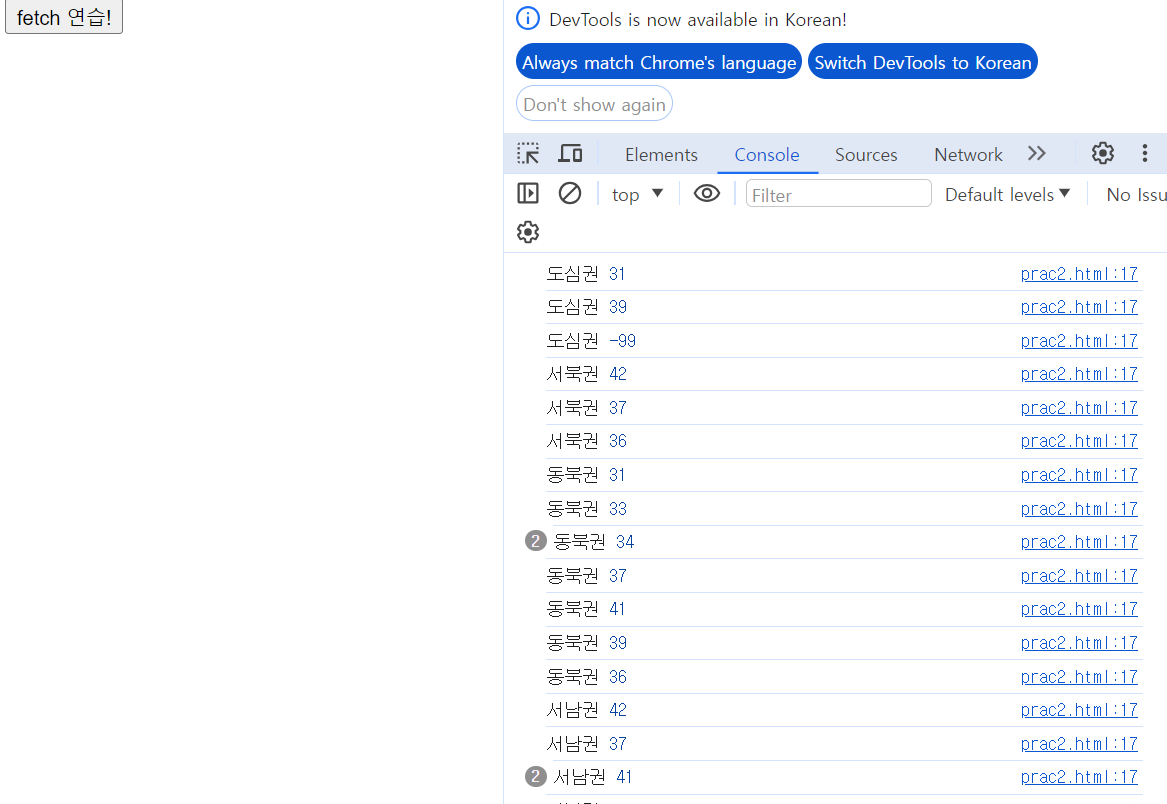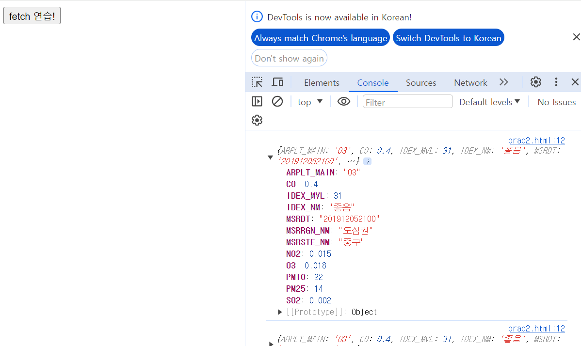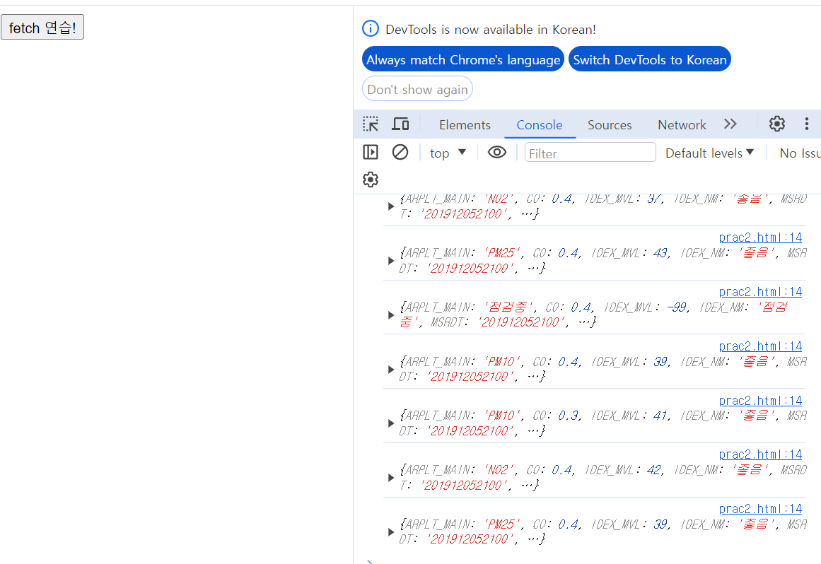 fetch 연습을 누르면 console에서 서울미세먼지 데이터를 가져온 화면이 나온
