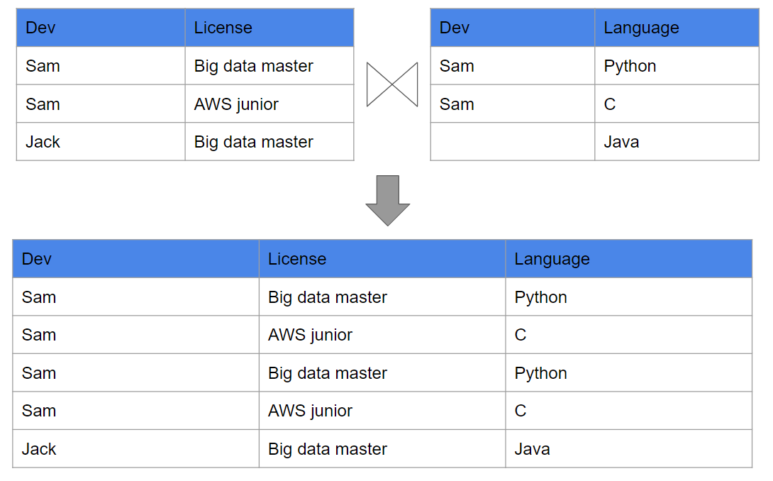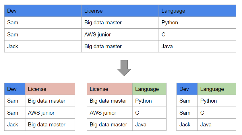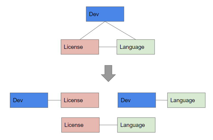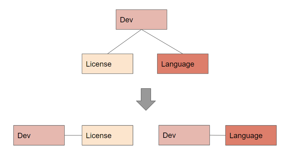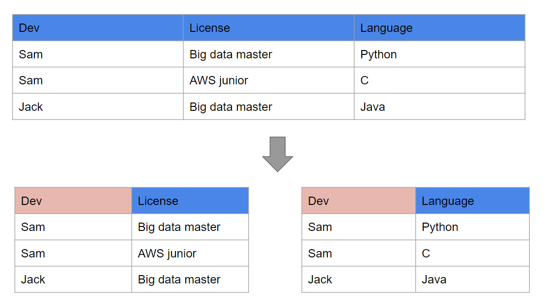 위의 테이블에서 첫번째 테이블은 개발자는 많은 자격증을 가질 수 있고 많은 언어를 사용할 수 있다.