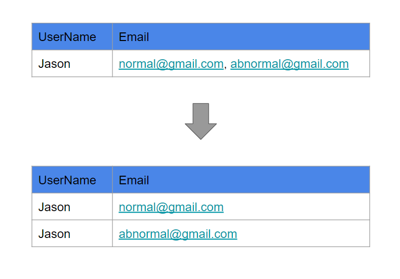 위 테이블에서 한 Jason에게 두개의 Email이 붙어있다.(원자값으로 구성 X)