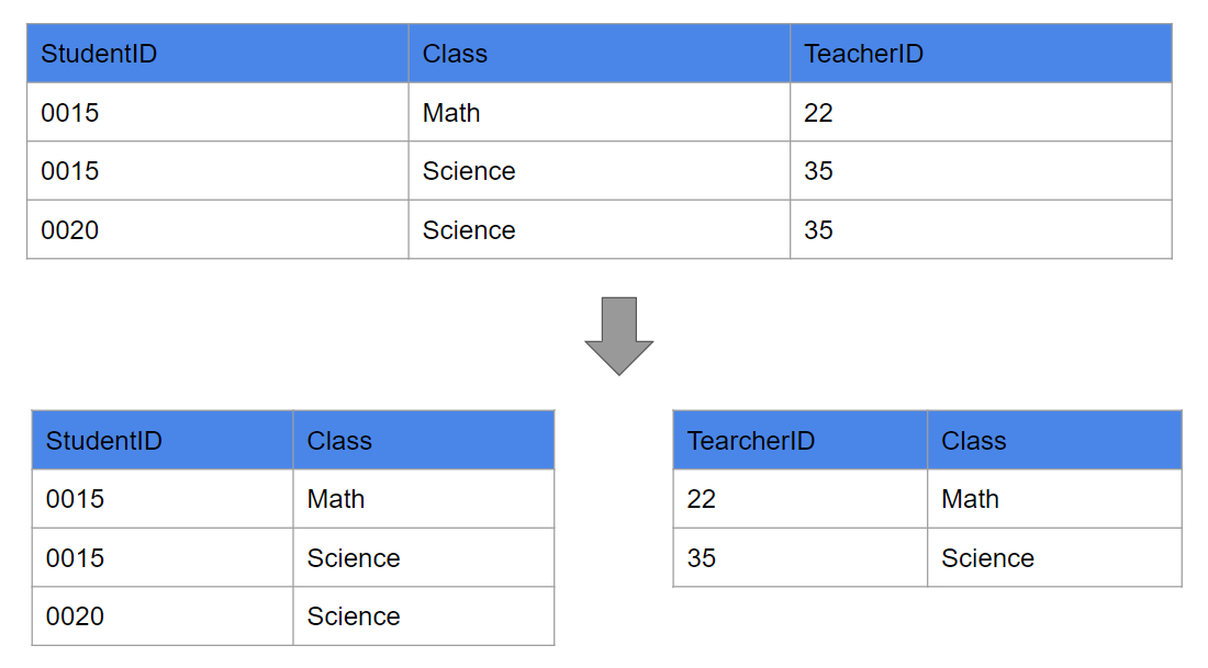 StudentId와 Class를 맺고 Class와 TeacherId를 연간을 맺어야 이상현상을 막을 수 있다.
