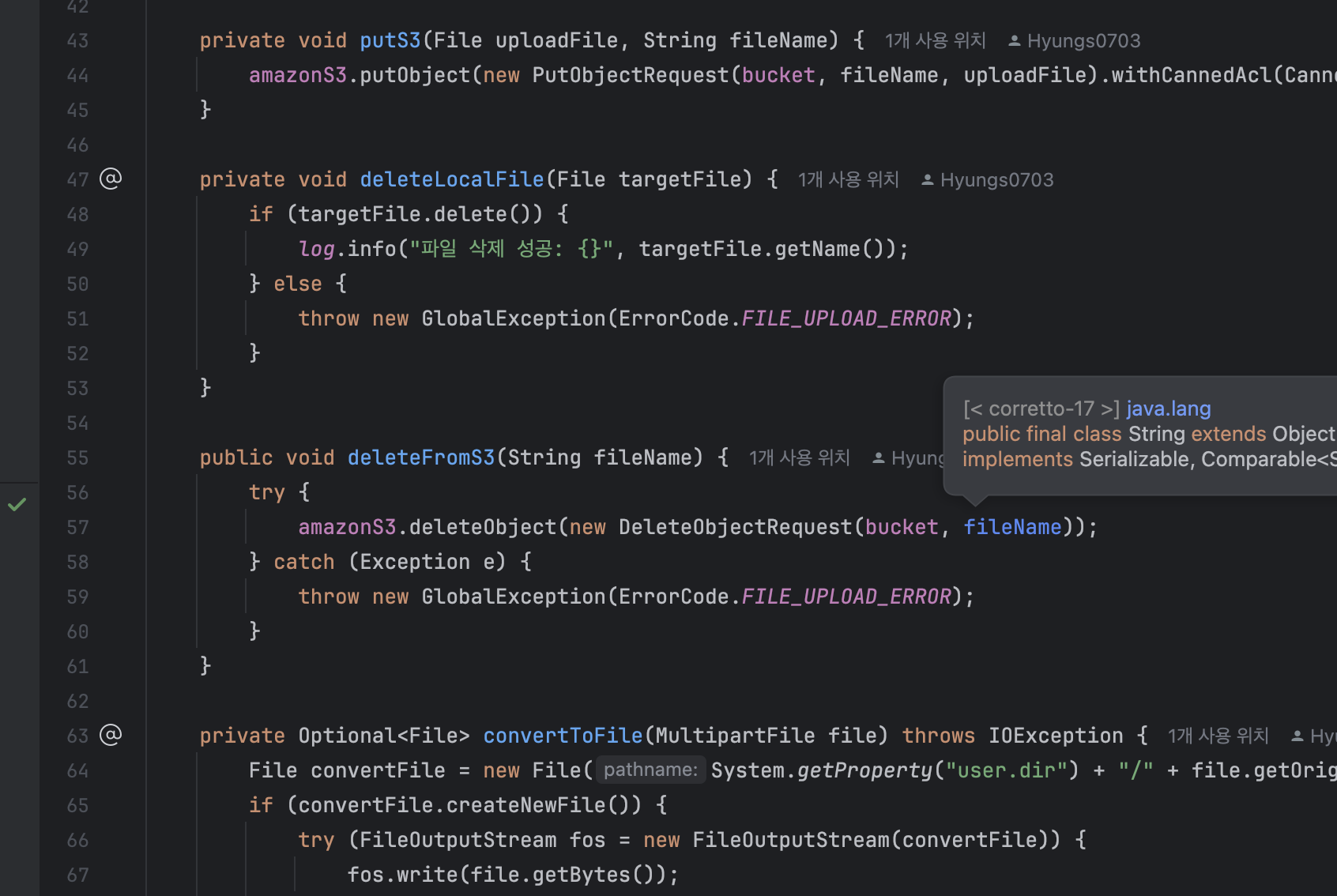 해결 방법 파일 업로드 시 S3 버킷 이름을 포함한 객체 키(Object Key)만 저장하고, 삭제할 때 해당 키를 사용하여 정확한 파일을 참조하도록 로직을 수정했습니다. 이를 통해 파일 삭제가 정확히 이루어지도록 하였습니다.