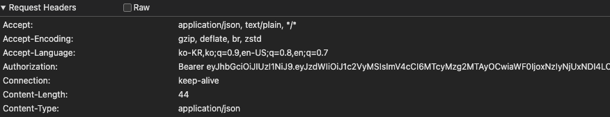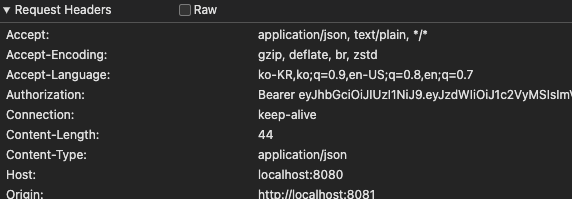 //프론트 엔드의 개발자도구를 열어보면 request 부분에 헤더를 넣어준다.