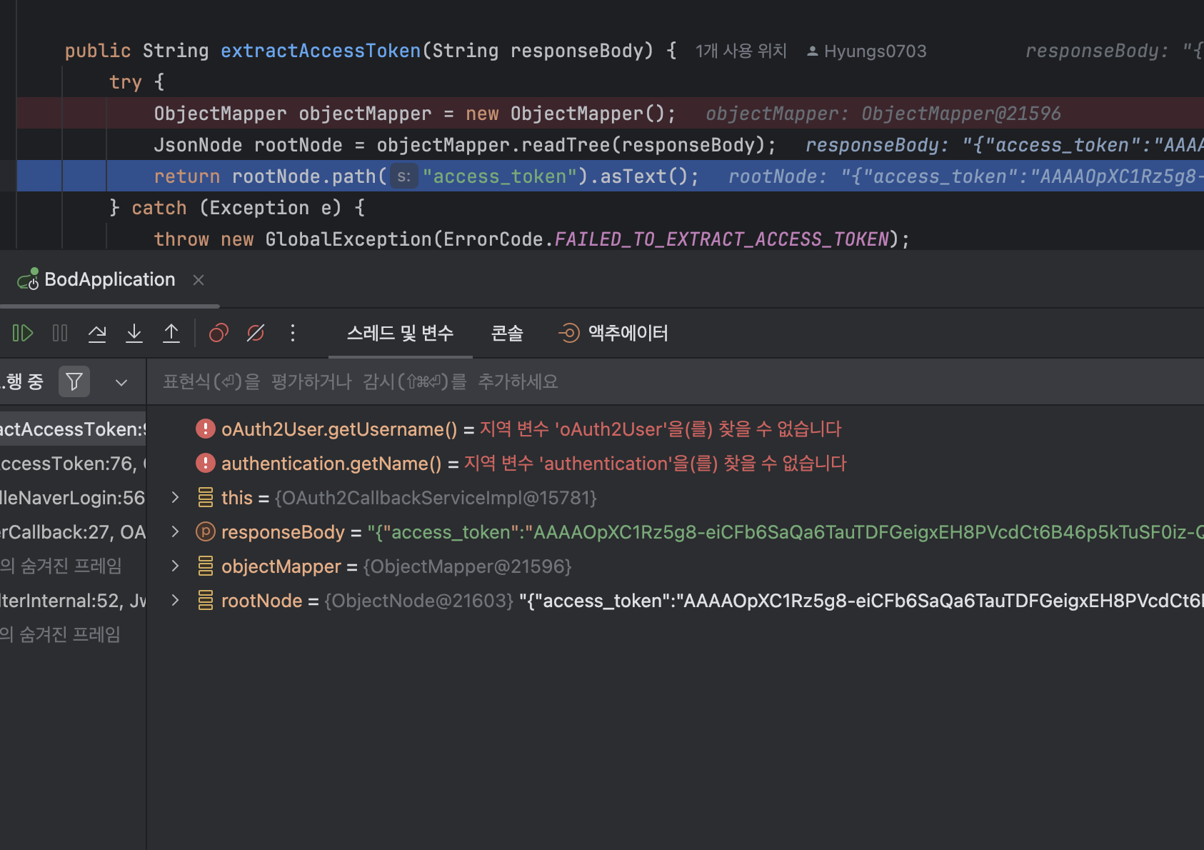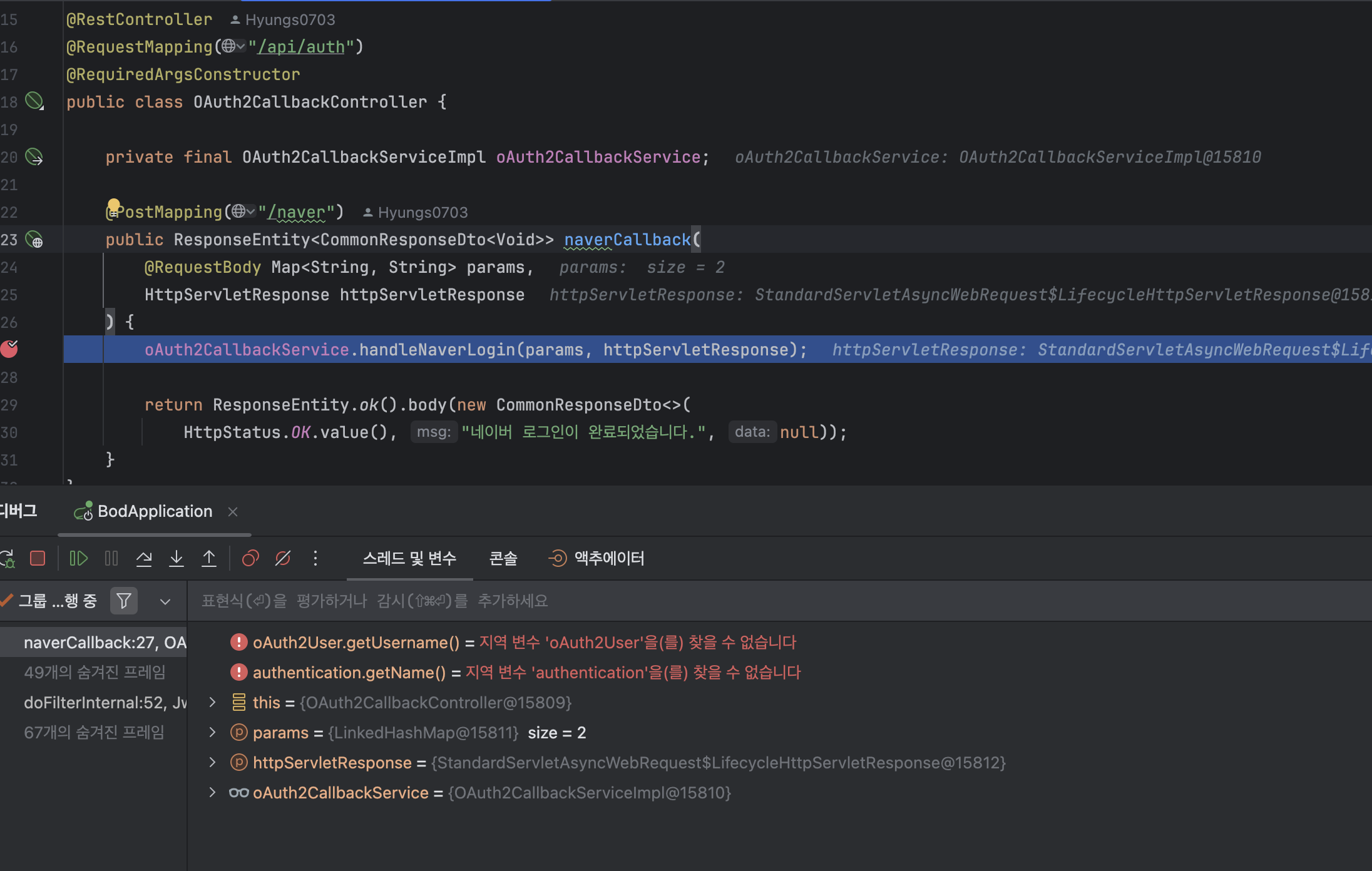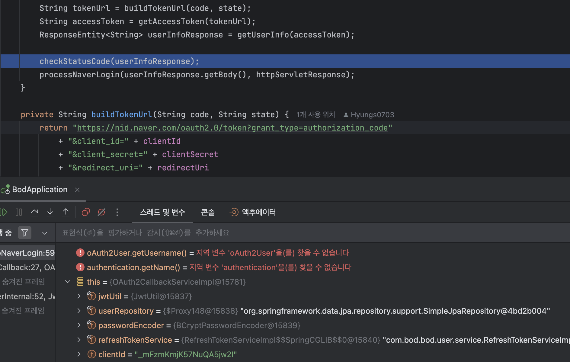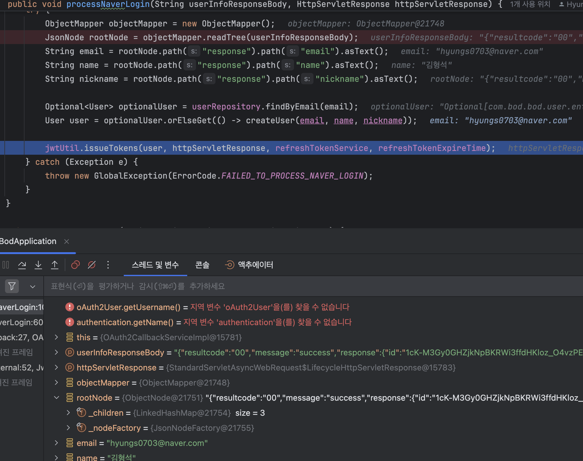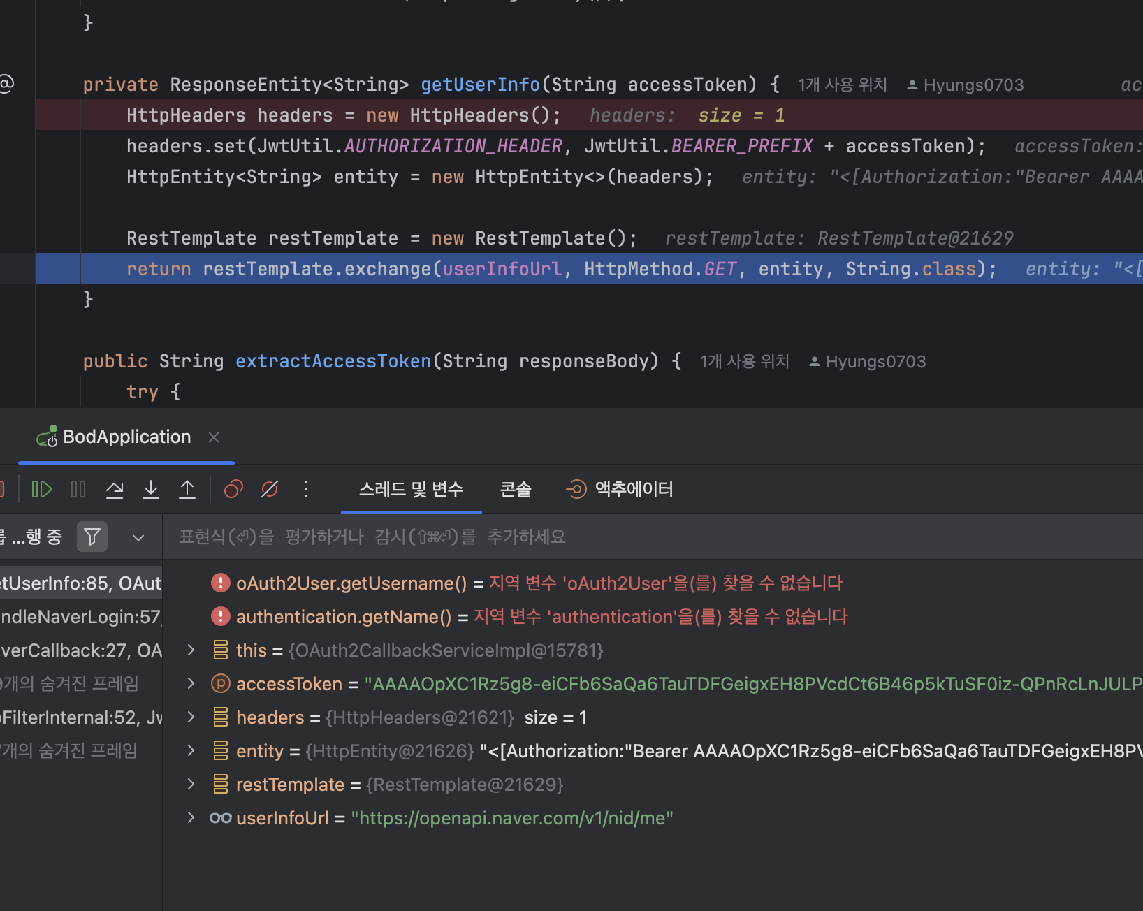 네이버 로그인 API를 프로젝트에 통합할 때, 초기 설정과 API 호출 과정에서 여러 문제가 발생했습니다. 특히 RestTemplate을 사용한 HTTP 요청에서 엑세스 토큰을 가져오는 과정에서 예상치 못한 오류가 발생하거나, API 호출 후 반환된 데이터를 처리하는 데 문제가 있었습니다.