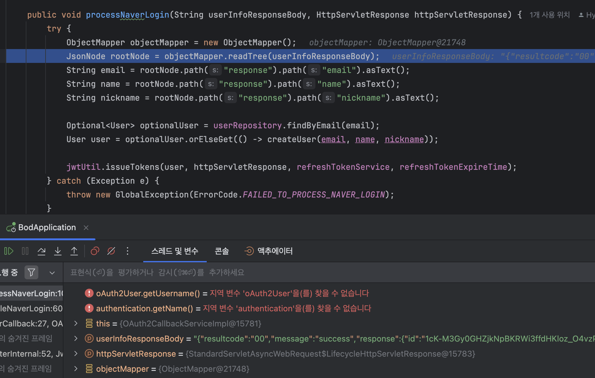 여기서 response안의 email을 가져오기위해 rootNode를 사용하였고 (key안의 value를 가져오기위해)