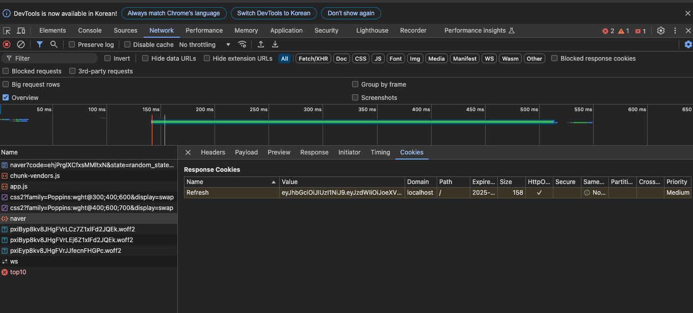네이버 로그인을 통해 사용자를 인증한 후, JWT 토큰을 발급하고 사용자 세션을 유지하는 과정에서 어려움이 있었습니다. 특히, 네이버 로그인에서 받은 엑세스 토큰을 백엔드로 전달하고, 이를 기반으로 JWT 토큰을 생성하는 로직에서 오류가 발생했습니다.