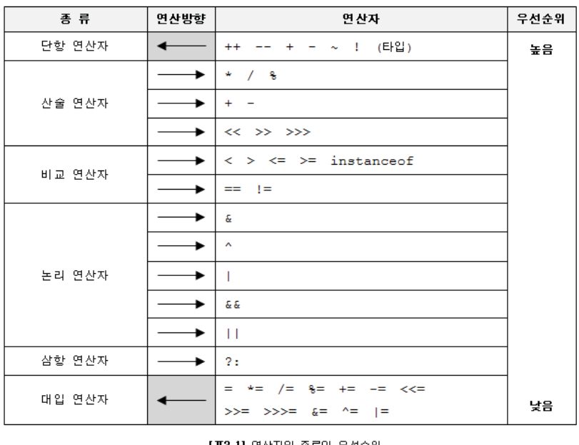 - 단, 단항, 대입 연산자만 오른쪽에서 왼쪽
