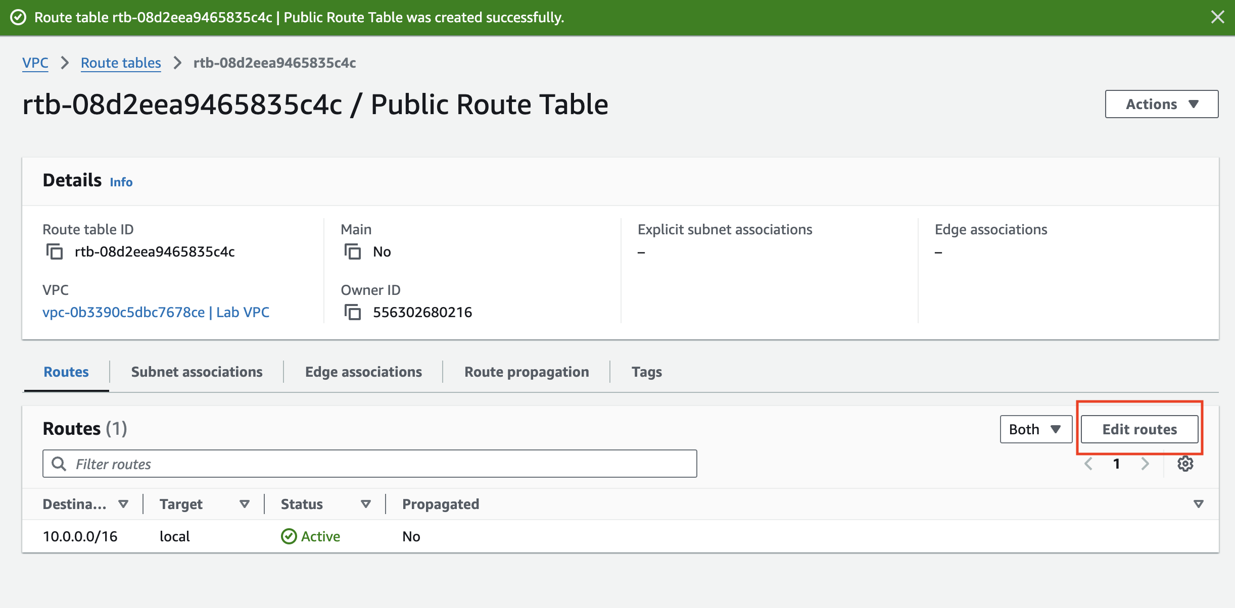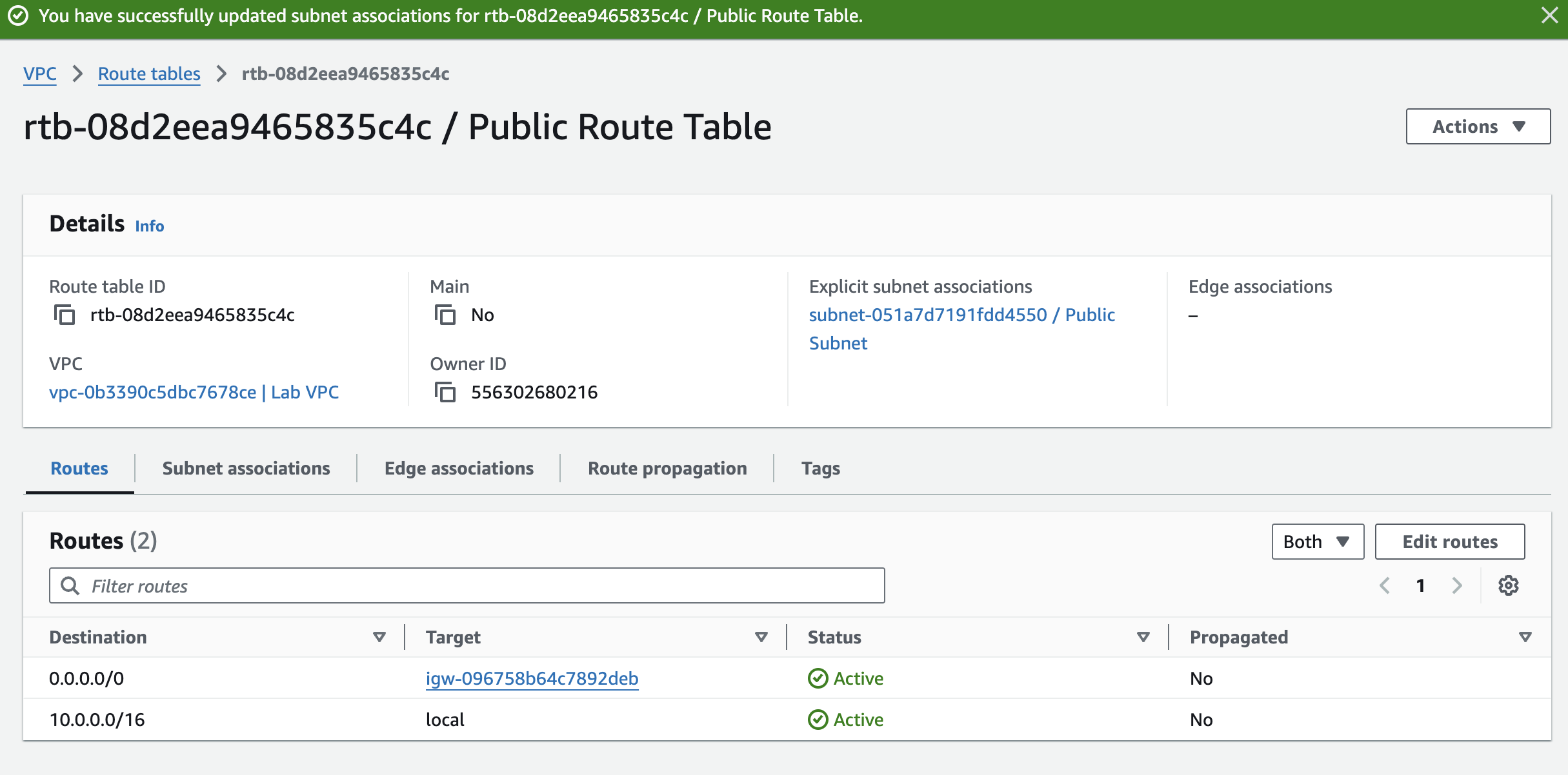 이 서브넷은 인터넷 게이트웨이를 통과하는 인터넷으로의 경로를 포함하므로 이제 퍼블릭 상태입니다.