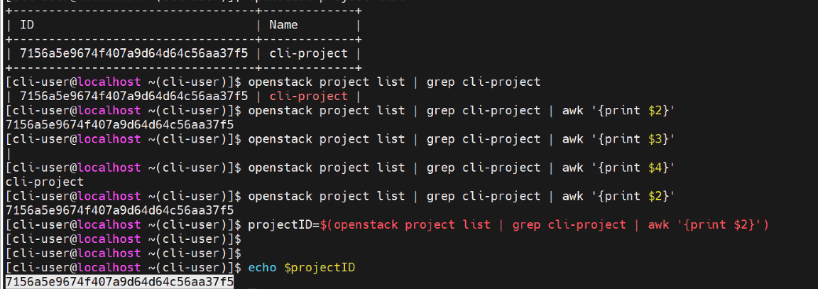 projectID=$(openstack project list | grep cli-project | awk '{print $2}')