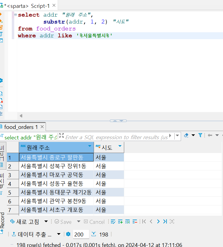 SELECT SUBSTR(addr, 1, 2) "지역",