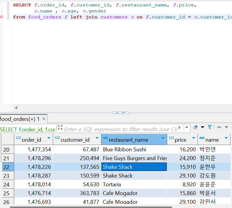SELECT f.order_id, f.customer_id, f.restaurant_name, f.price,