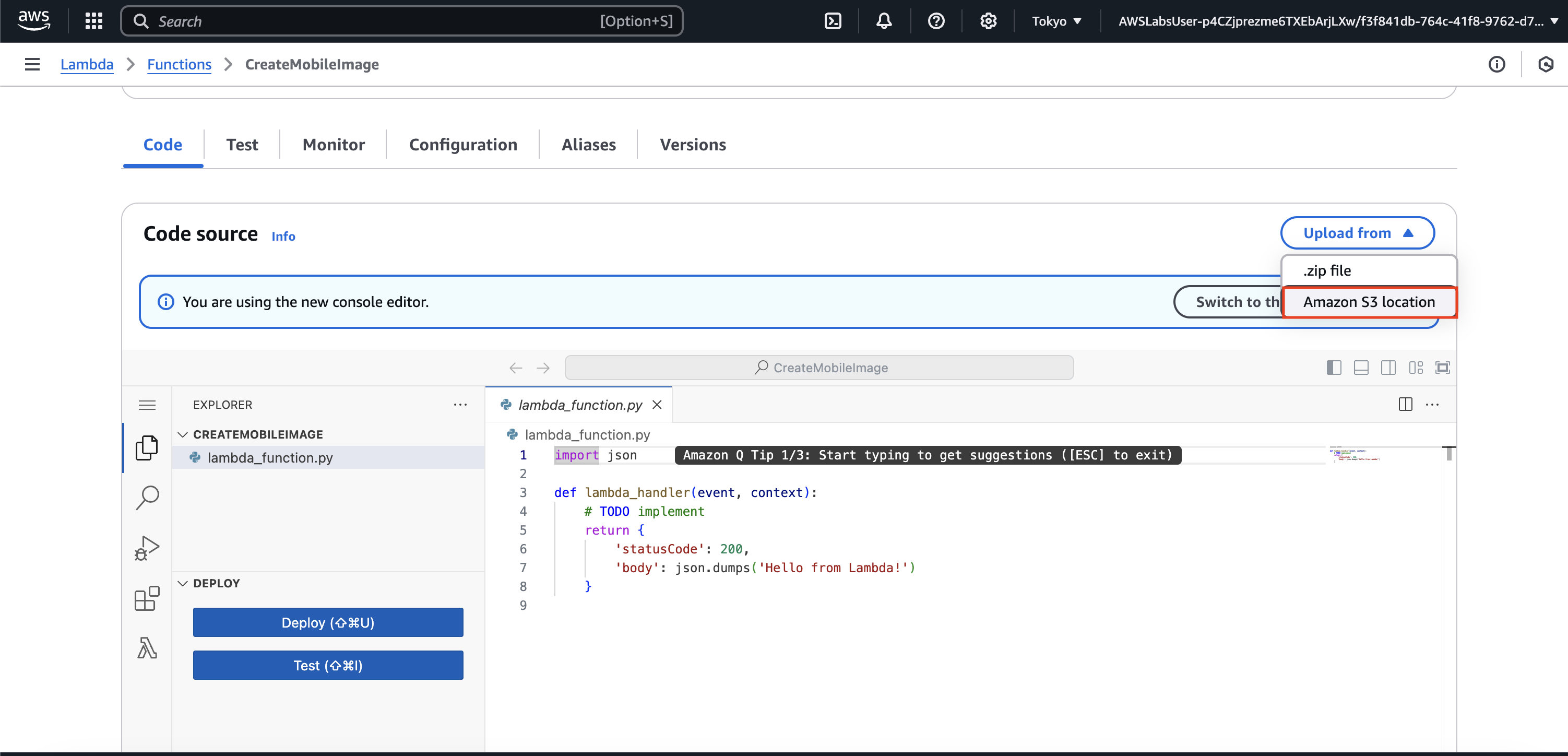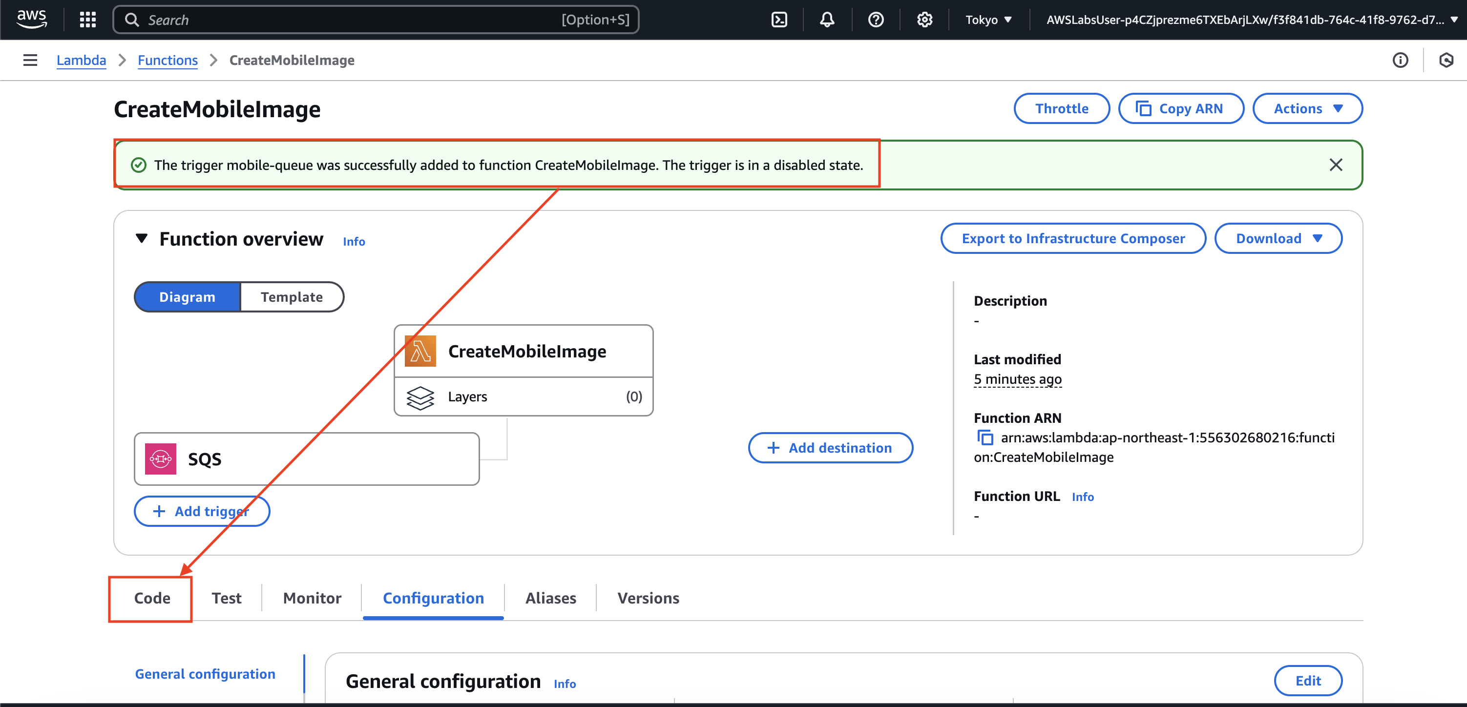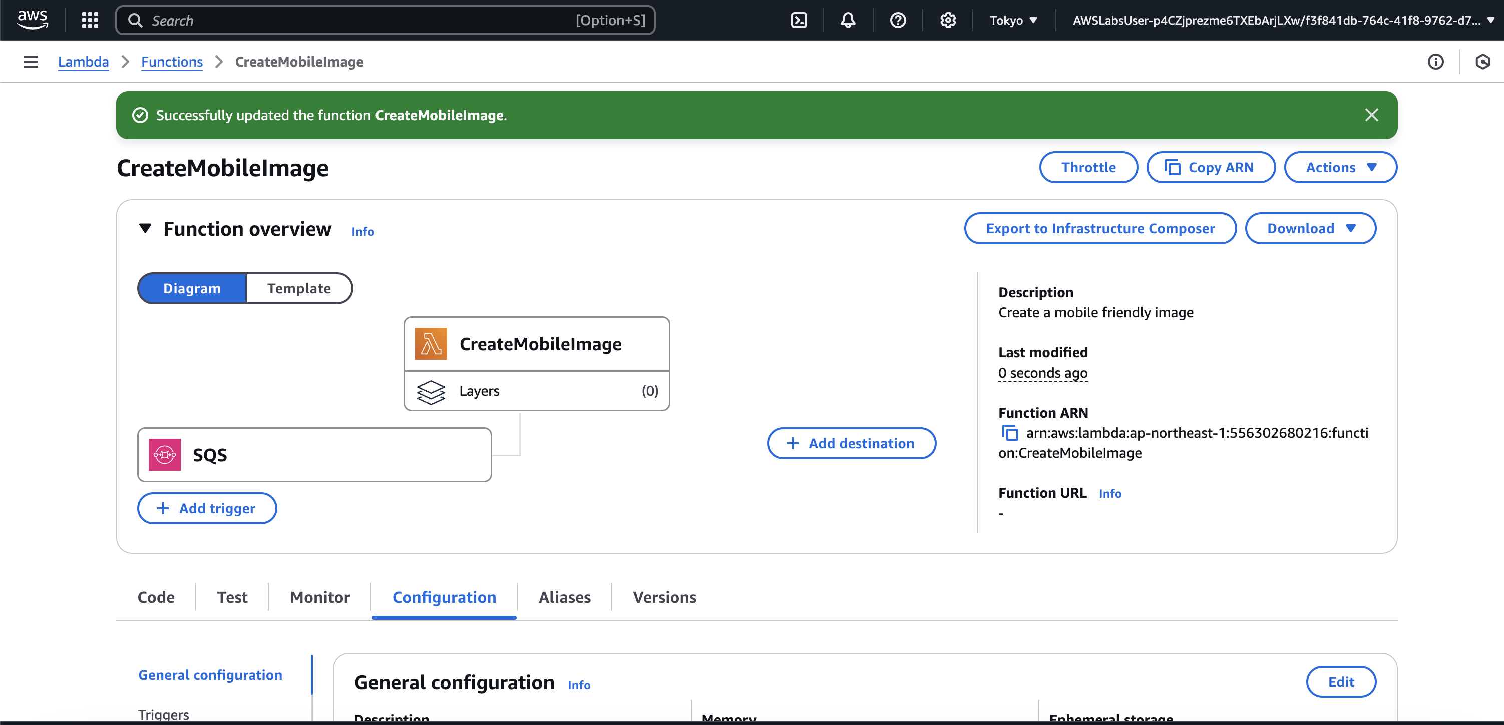 과제 4.4: SQS 트리거를 추가하고 Python 배포 패키지를 업로드하도록 CreateMobileImage Lambda 함수 구성