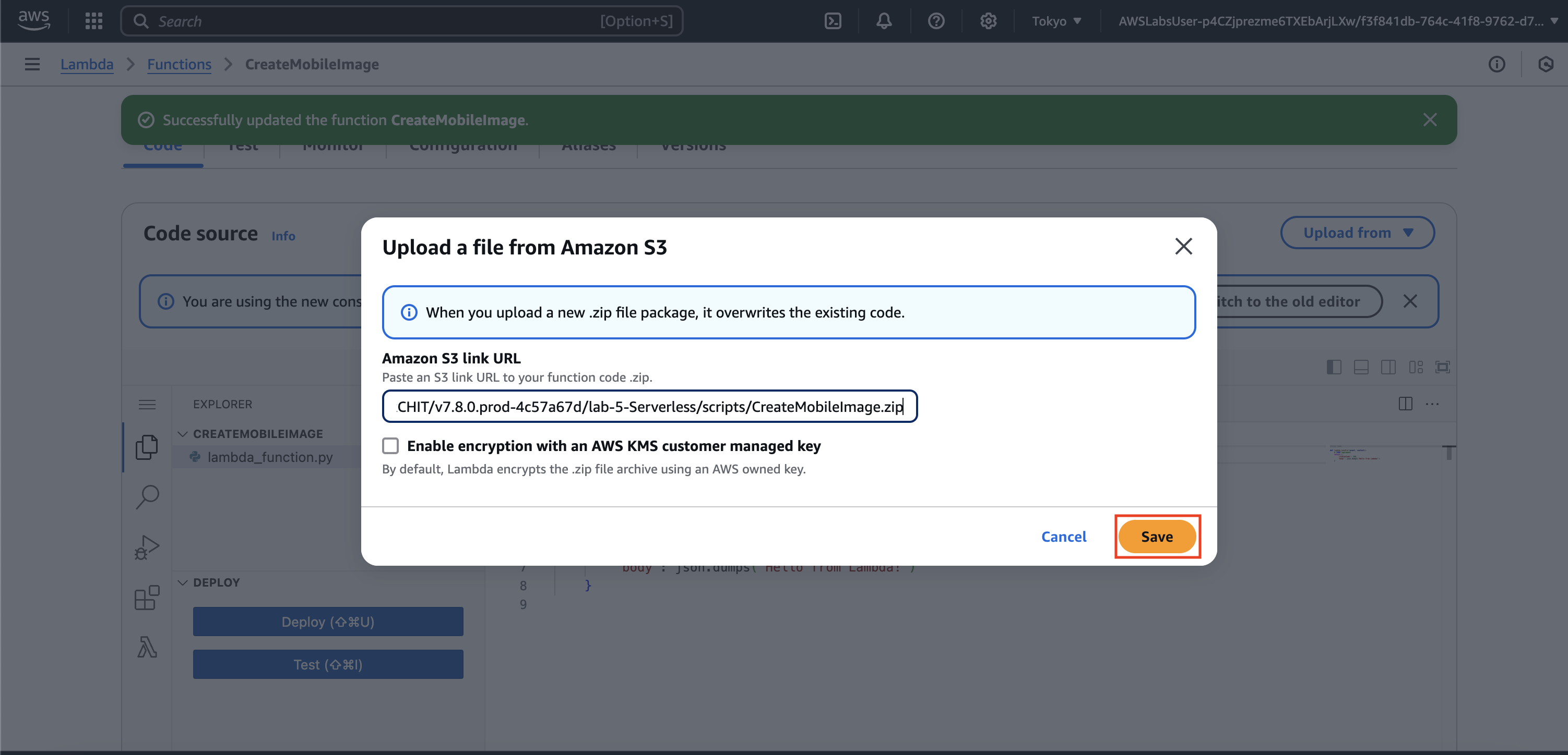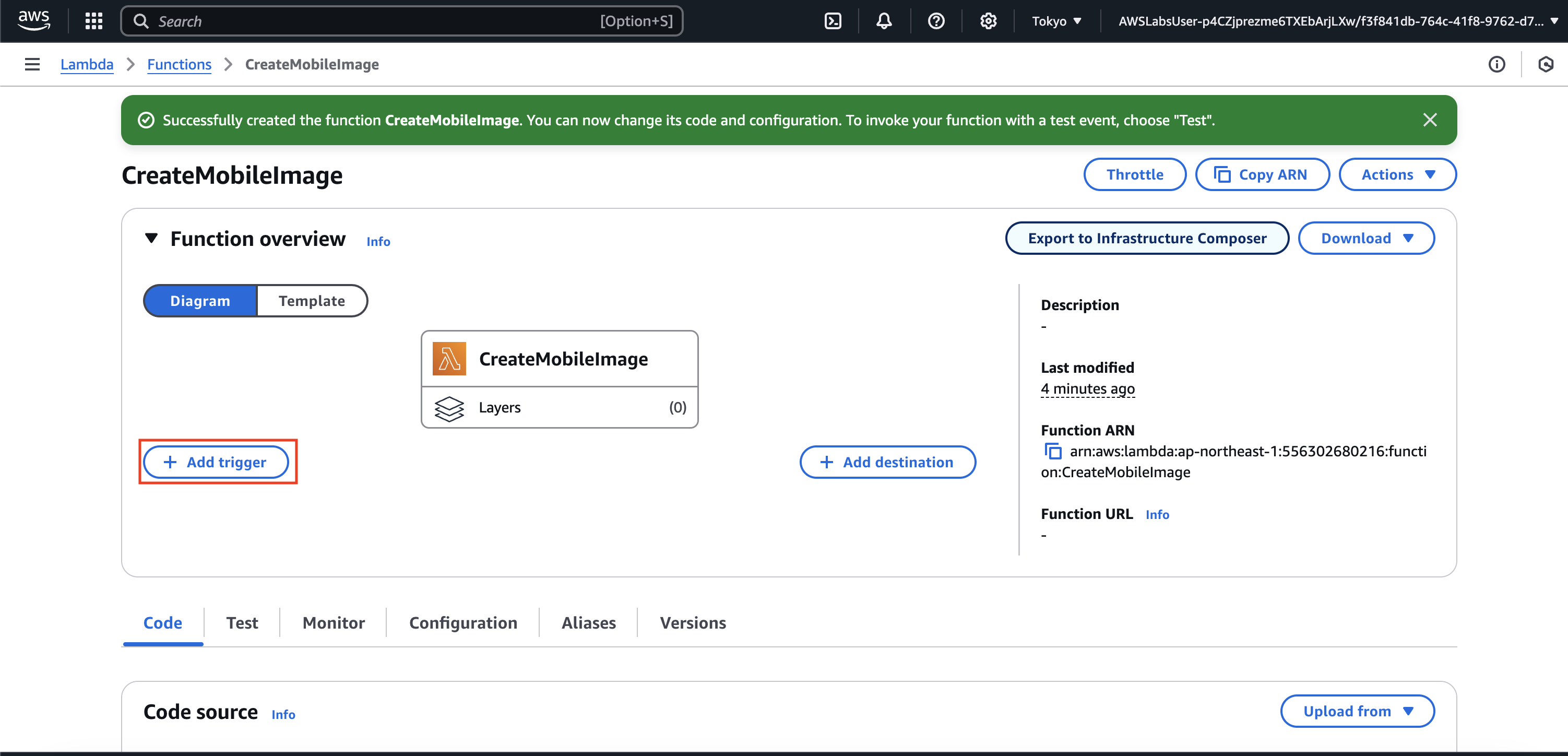 과제 4.4: SQS 트리거를 추가하고 Python 배포 패키지를 업로드하도록 CreateMobileImage Lambda 함수 구성