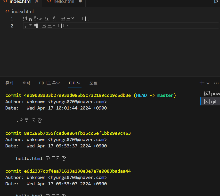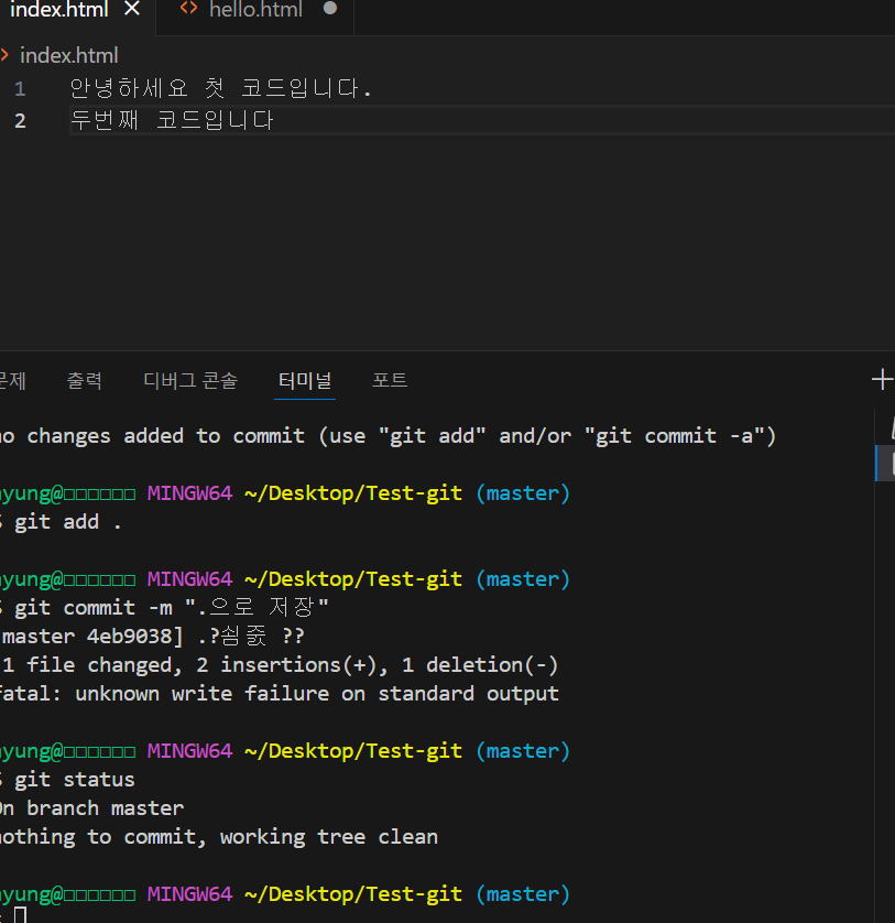 - 코드 저장 명령어를 실행한다. git add. & git commit -m "메세지"