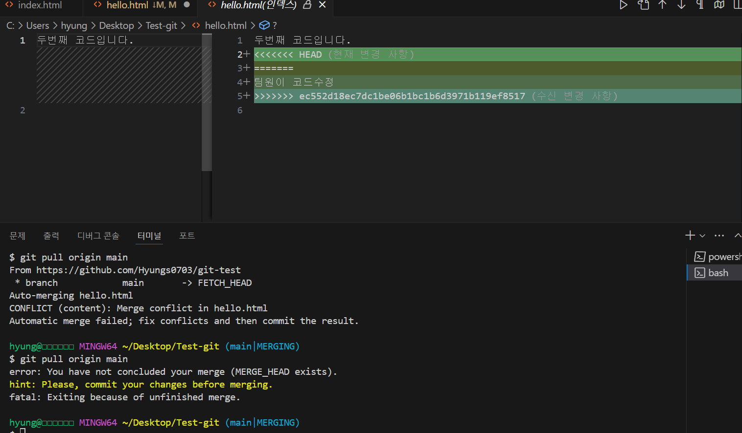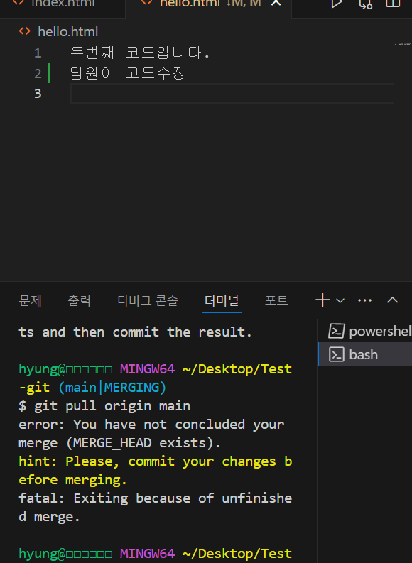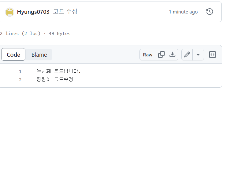 팀원이 수정된 코드를 가져오지않고 수정하려 하면 에러가 나온다.