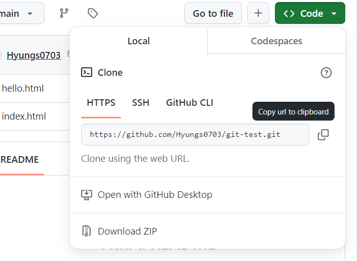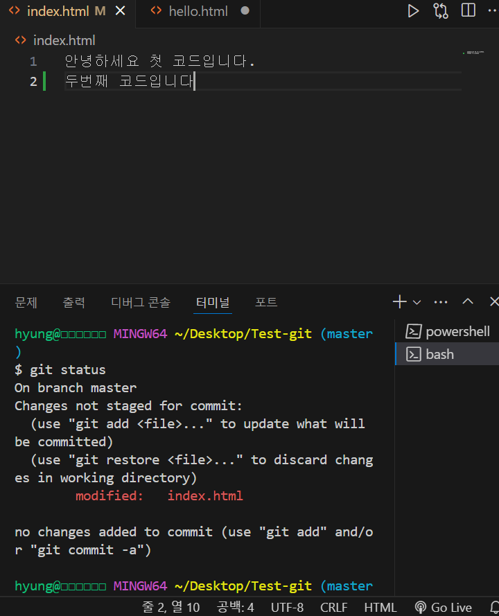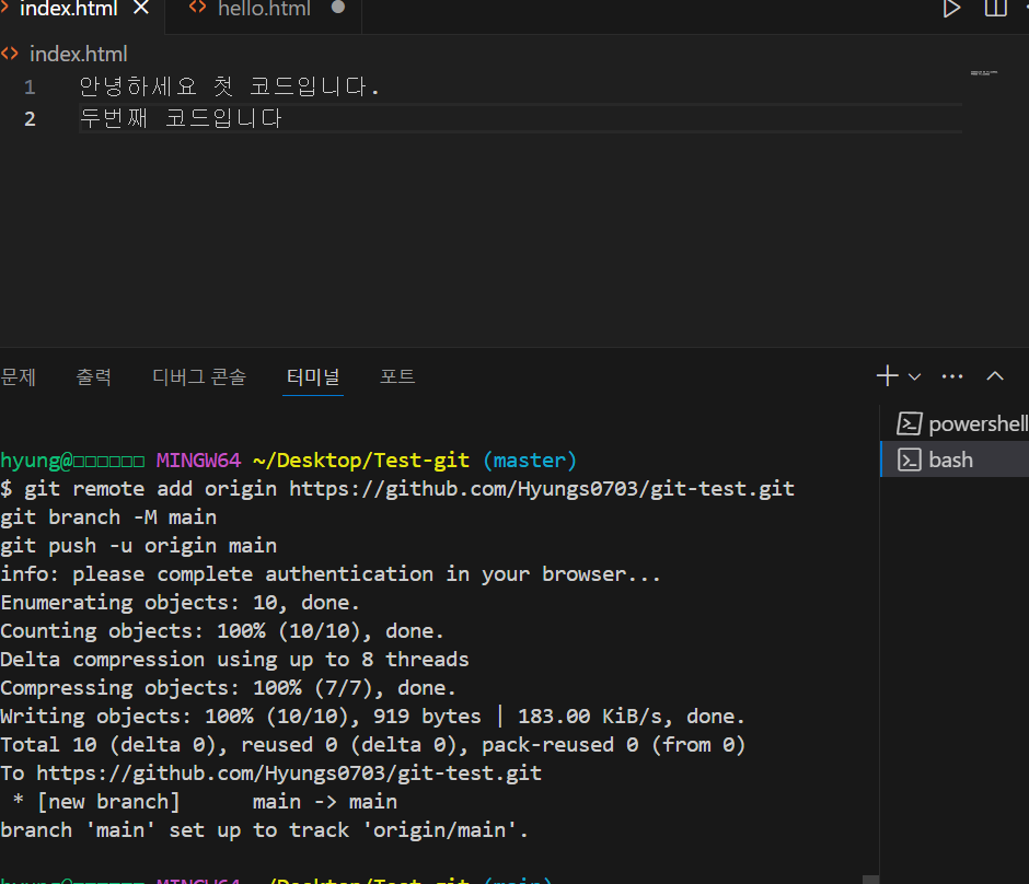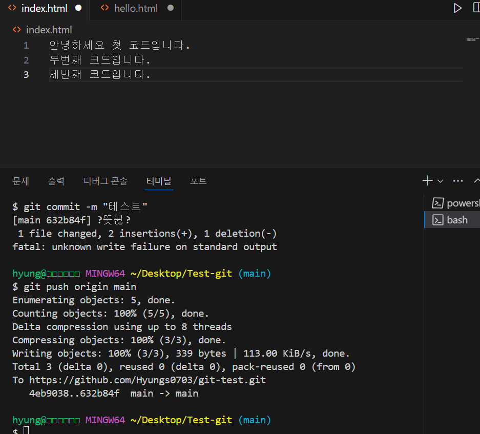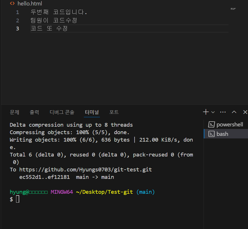 코드를 수정 -> 저장 crtl + s -> git add . -> git commit -m "수정완료" -> git push origin main -> 완성된다.