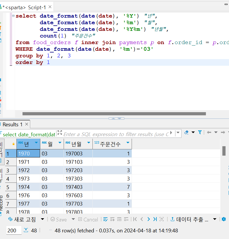 - where절을 주어 문자형으로 바뀐 date를 '03'월만 맞춰 출력할 수 있다.