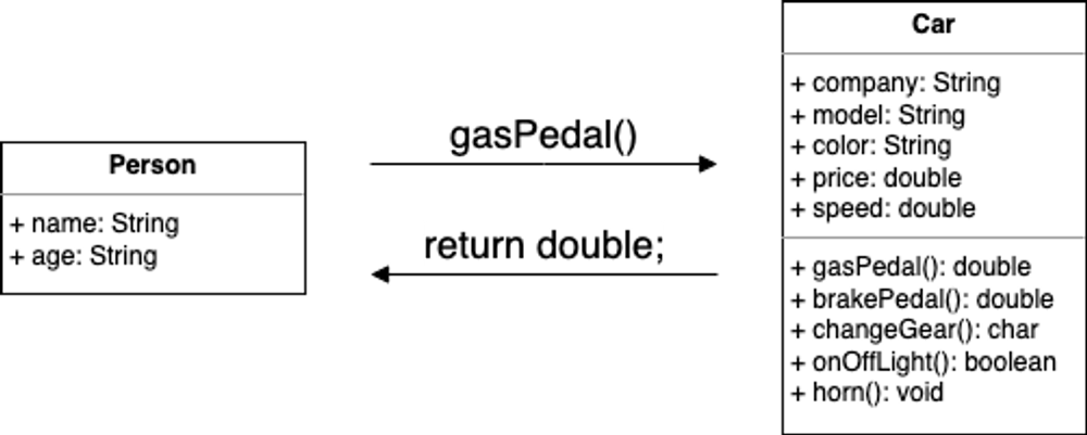왼쪽에 Person(사람)이 Car의 gasPedal()을 호출한다 => Car는 이에 반응하여 가지고있는 값을 보낸다.