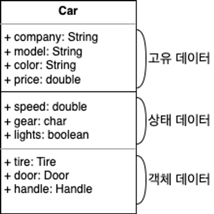 Java에서는 위와같은 속성과 행위를 필드의 메서드로 정의하여 구현할 수 있다.