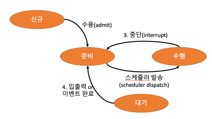 프로세스 생명주기 : 신규 - 준비 - 수행 - 대기 - 종료