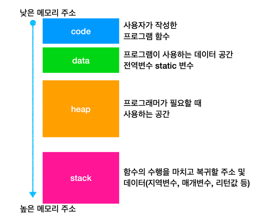 - 메모리 주소 값에 의해서만 참조되고 사용되는 영역이다. 따라서, 프로그램 동작시 (런타임)에 크기가 결정됨
