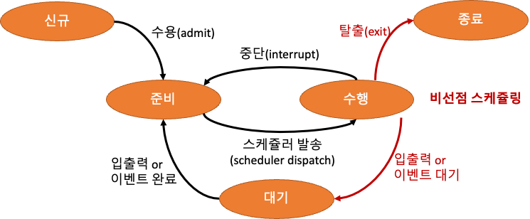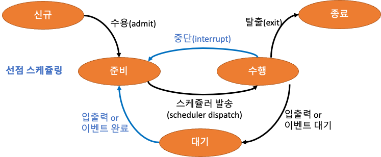 - 선점 스케쥴링에 의해 중단되면 준비상태