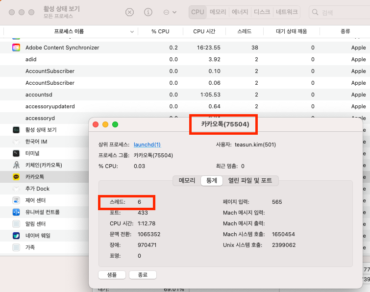 쓰레드는 필요할 때마다 생성되며, 프로세스 상세의 스레드 수는 최근 평균 스레드 갯수 통계값