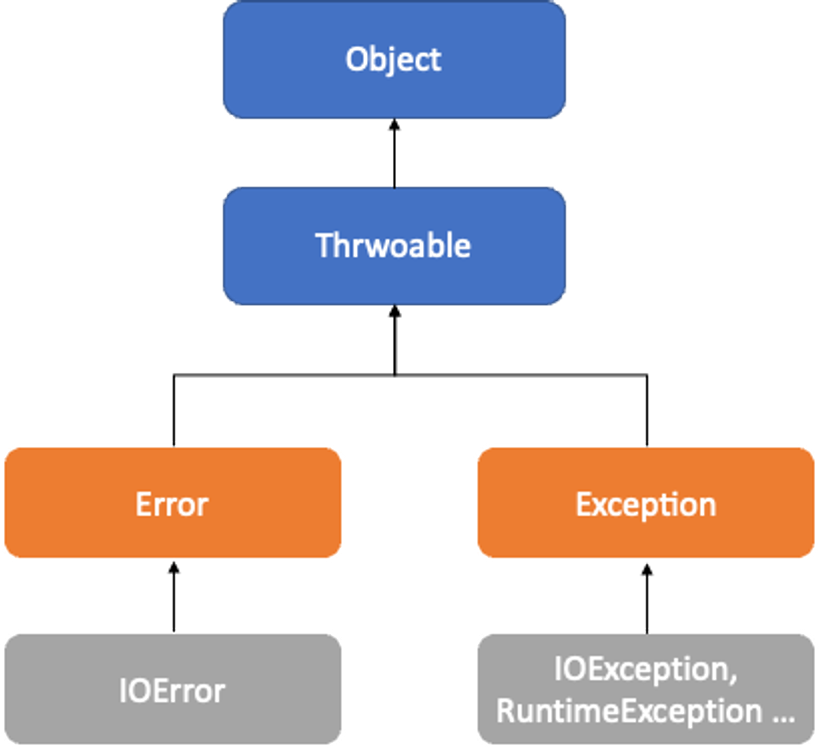 오류(Error) 일반적으로 회복이 불가능한 문제이다.시스템 레벨에서 아니면 주로 환경적인 이유로 발생한다.코드 문제로 발생하는 경우도 있으나 발생한다면 회복이 불가능하다.예외(Exception)
