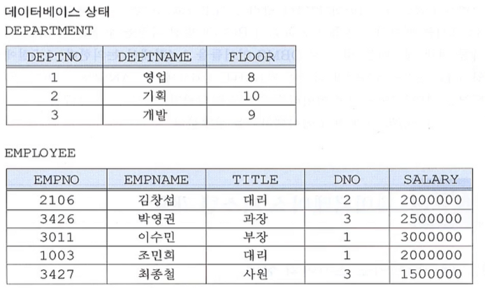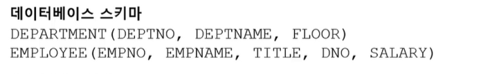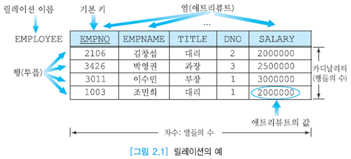 - Ex) EMPLOYEE 데이터는 EMPNO, EMPNAME, TITLE, DNO, SALARY 필드를 가진다.